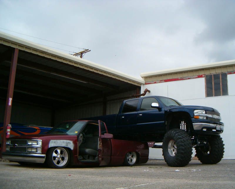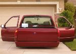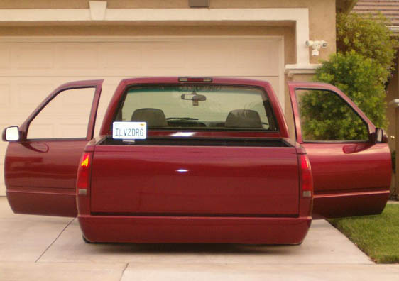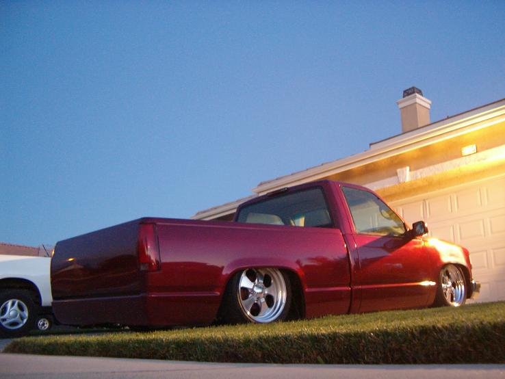 shaved door handles, tailgate handle, antenna, stake pockets, smooth roll pan, clears corners up front. 3 stage mitzu burgundy with some nice primer spots on the front fenders....