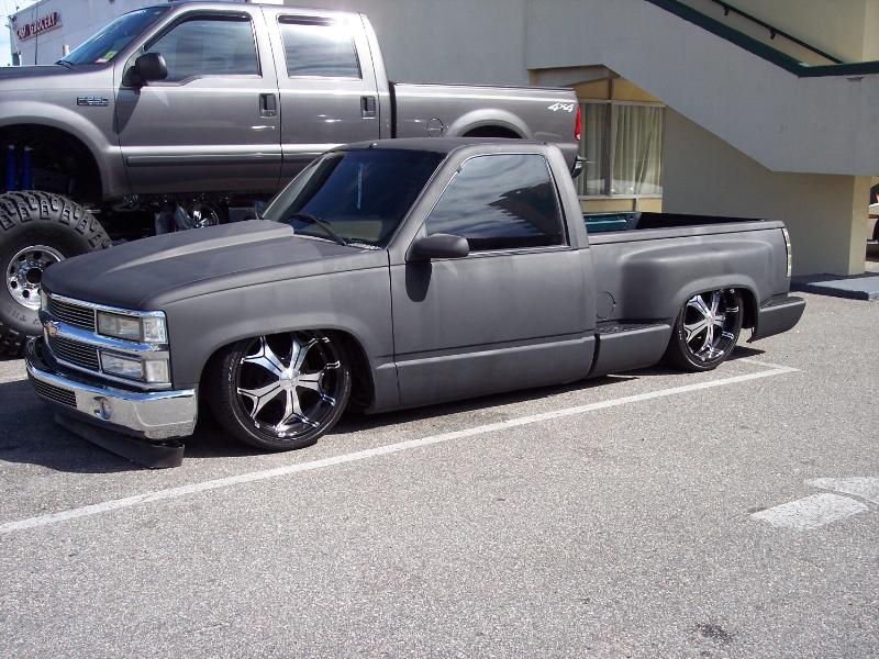 As of nov 08 the truck is setten at blockerboyscustoms in sc body is off the frame new frame with all new airride from suicidedoors.com added a wattslink airridetech control arms frame is being painted and supension parts powdercoated gona bolt up a new set of billet bonspeed 22s caddy clip is ready to go new paint with tribals new glass rino line the bed notch cover airbrushed dont know with what yet 8 6inch spikes to hold notch cover down some billet should be hitten up shows by first of next year when i get back from iraq will try and post some pics soon if you know where a good place to have the inside of the truck done around sc let me know