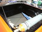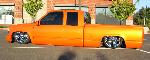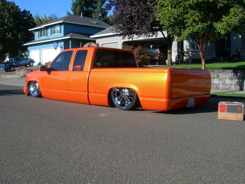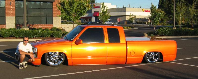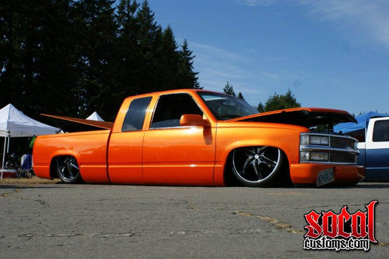 Shaved Everything, Sikkens Lamborghini Orange Pearl, Custom Graphics on the hood, LED Tail lights in the roll pan, French License Plate, Rag Top.