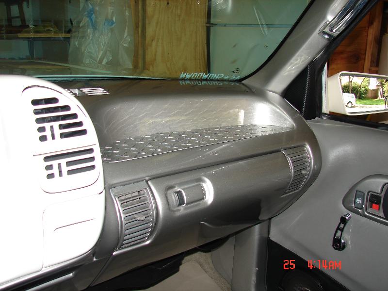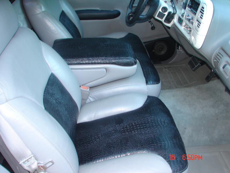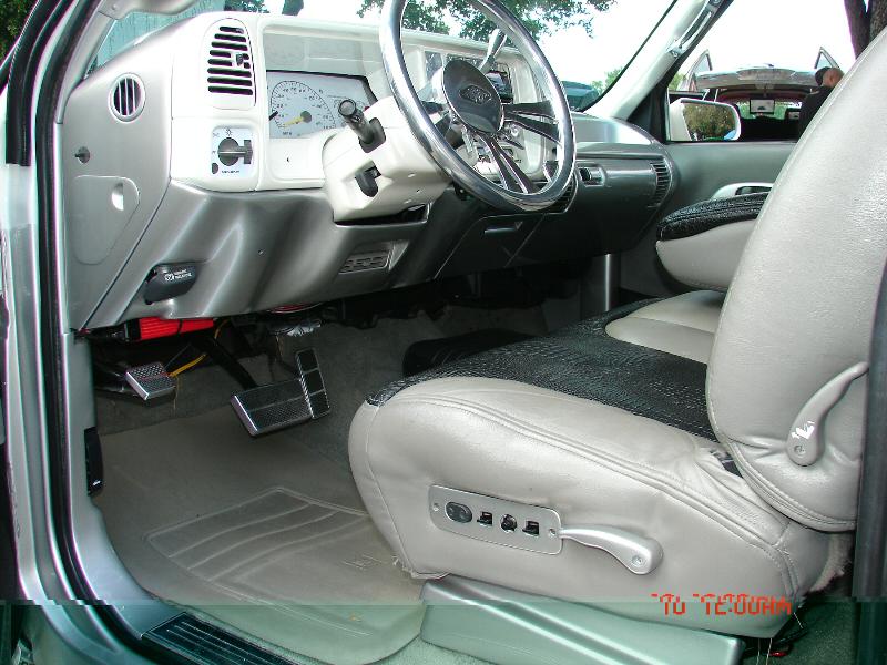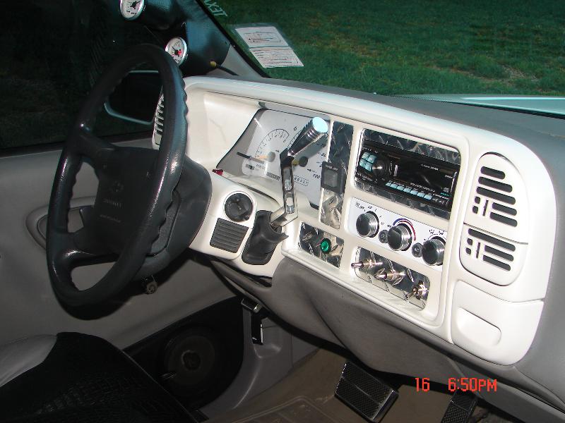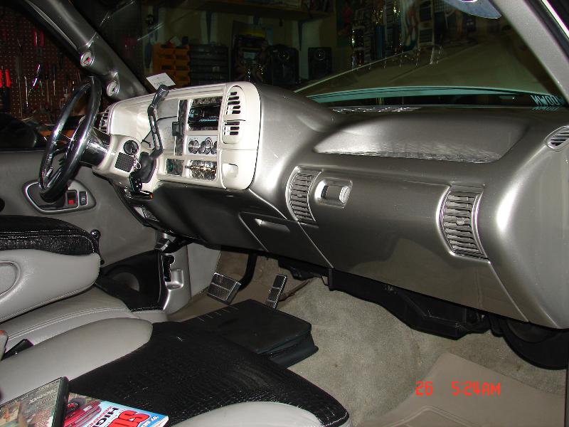 painted dash bezel white face gauges billet ac knobs,petals window cranks door sills door jam vents.98 suburban bench 40/60 splitw/custon baby croc inserts door panel done in grey vinyl w/ carbon fiber inserts. Visors in white carbon fiber