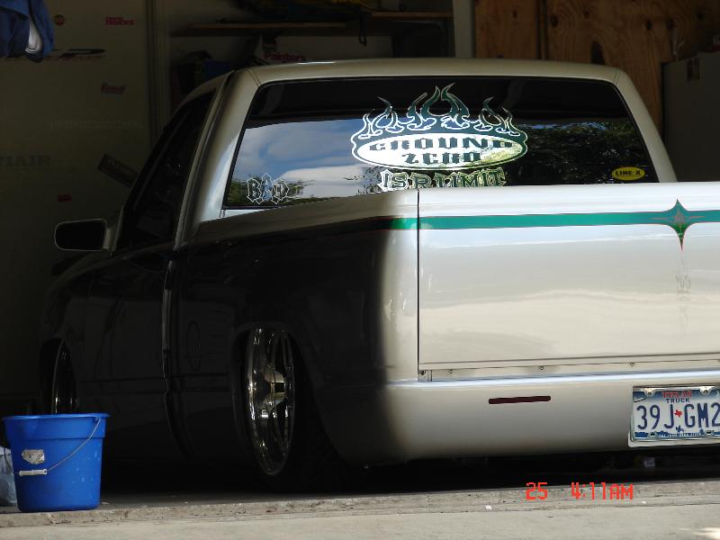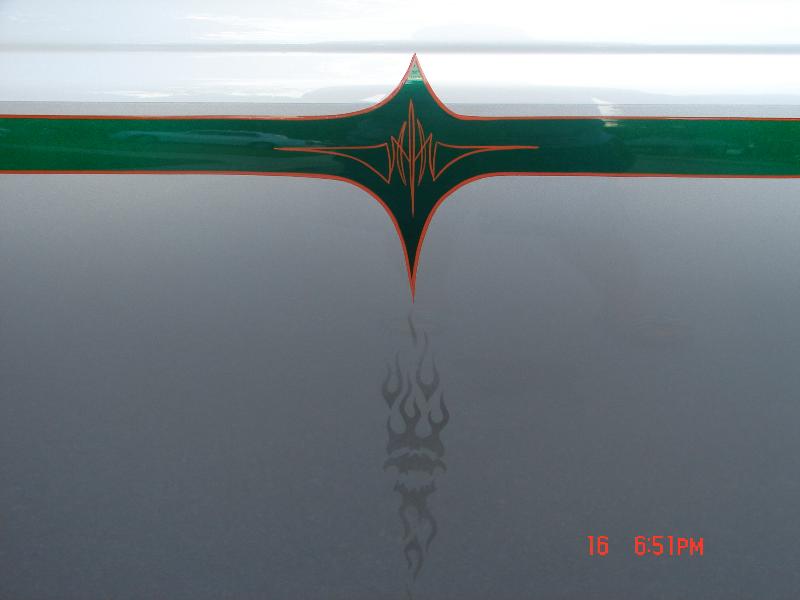 two tone paint pearl white on top gm grey on bottom w/candy green stripe @ orange pinstriping all in matrix colors.