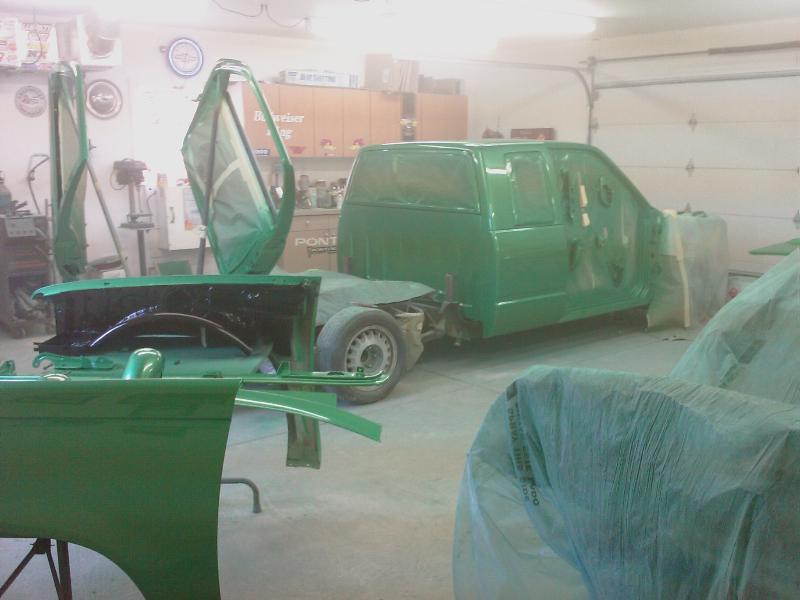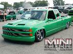 PPG electra green, with HOK grren ice pearl. Shaved clean with 15" led tails, Old school cowl hood. Blacked out phantom grill,