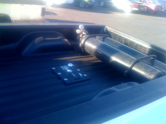 the bed and ported into the cab, fiberglass amp rack under back seats painted to match the truck.