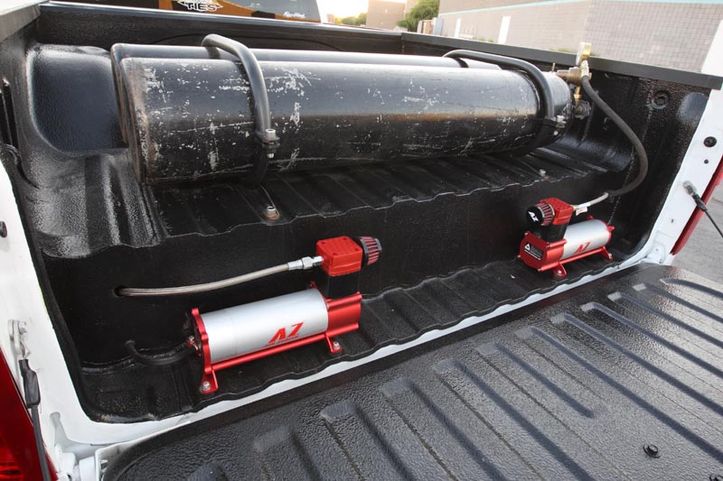 link and 6” slam specialties bags in front, 3” stock floor body drop, goose neck hitch built into bridge notch. Rear