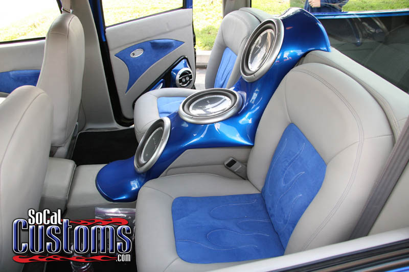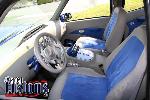 Mike's specialty as the Owner of LB Threads then came into play. His crew custom built a new dash and wrapped it in Futura Textiles Spectrum Pearl Gray and Synergy Blue Suede. The front seats were cut down and reshaped. The new interior received Dakota Digital Gauges as well as Empire Motorsports a billet shifter, pedals, air conditioning cover, door handles, and air conditioning vents. The rear seats were tossed out and replaced by cut down Chevrolet S-10 seats.