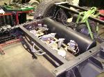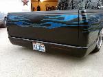 chrome front bumper w/recessed lic. plate, grant kustoms rollpan, and handle relocator. clear headlights, turn signals and corner lights and billet grill. shaved tailights with watsons streetworks leds. urethane black primer with tru blu pearl flames pinstripped in lime green