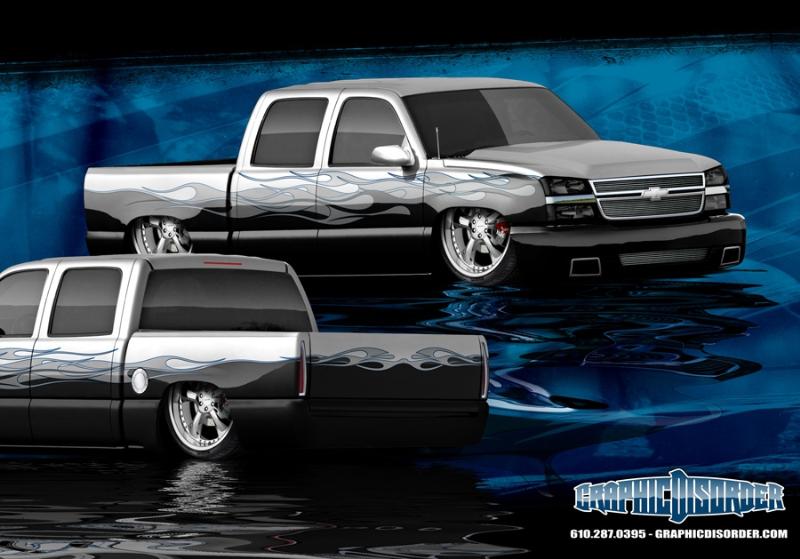 Trenz billet grill, T-Rex billet bumper inserts, APC headlights and turnsignals, Chevy HD hood, Cadillac door handles, smoked tail lights, shaved tailgate, molded rollpan, LED third brake light and line of fire