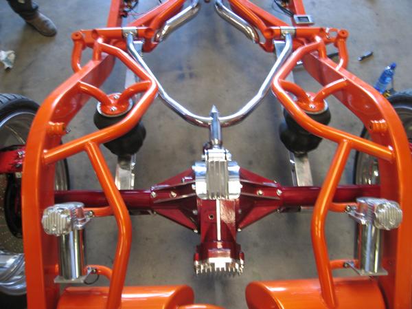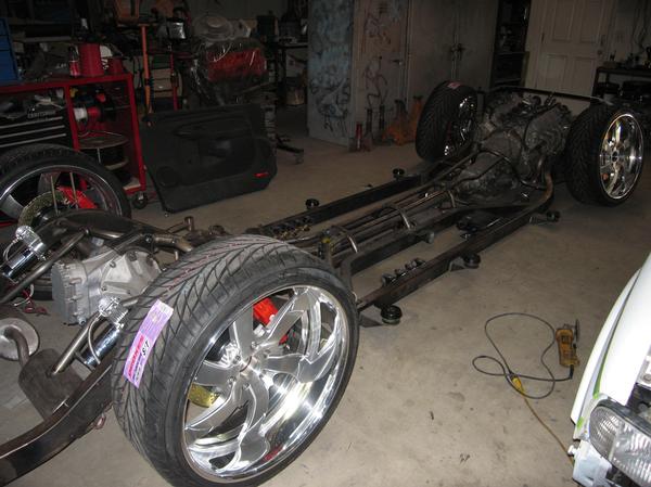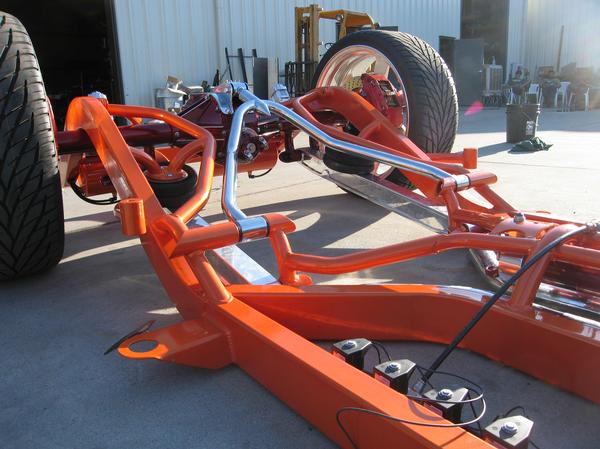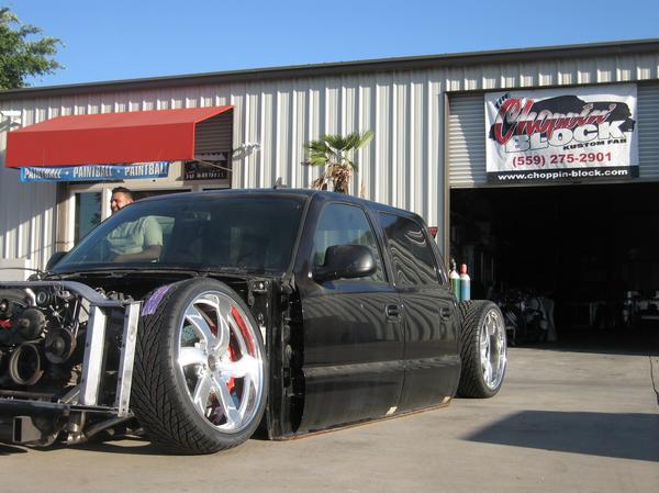 Bumper to bumper body drop mandrel bent frame. 4 3/4 body drop Cutoms made Billet Upper and Lower control arms. Custom made Billet Lower links. Speedway engineering Billet rear end.8" Slams all around. 3/8 line with 3/8 Parker valves. All the work is being done by Myself & PIMP Ass Carlos at our shop The Choppin' Block Kustom Fab (559)275-2901