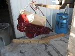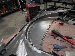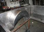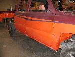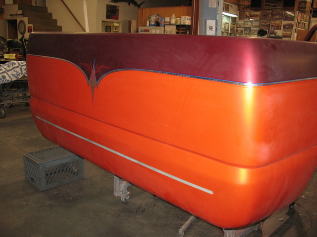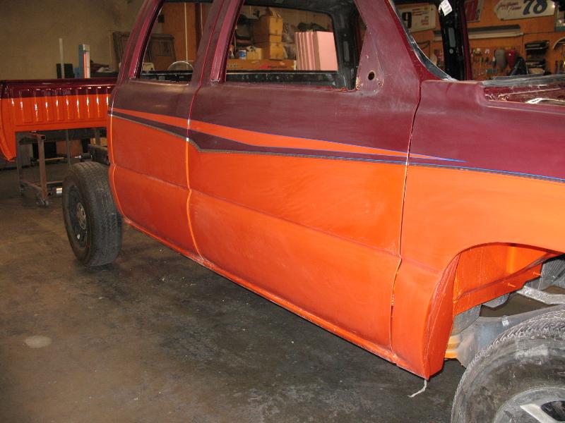 Lamborghini orange with Candy wine red. Silver leafing with a blue pen stripe. Fully shave. Custom made front bumper. Full custom sheet metal bed. 61" LED