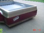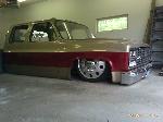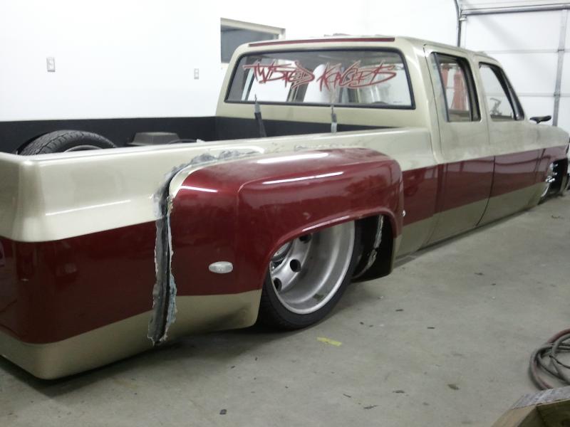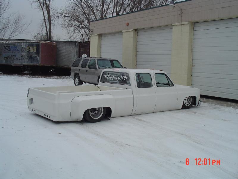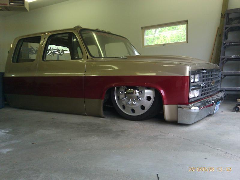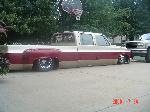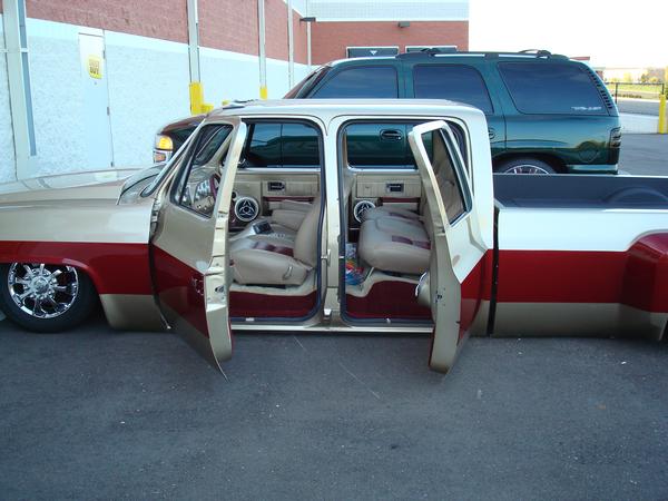 Shaved front and rear marker lights, door handles and key holes, wiper cowl, tail lights, tailgate, both gas doors, stake pockets, upper cab seems, drip rails, fire wall, tailgate and roll pan welded in. Rear flares are molded in. Suicide rear doors, rebuilt inside of bed with square tubing and smoothed it all out, body dropped.Cadillac Seville 3rd brake light, front inner fenders, cowl hood. Two tone Cashmere Biege and Red Fire paint. New suburban grill. Line-X spray-in bed liner