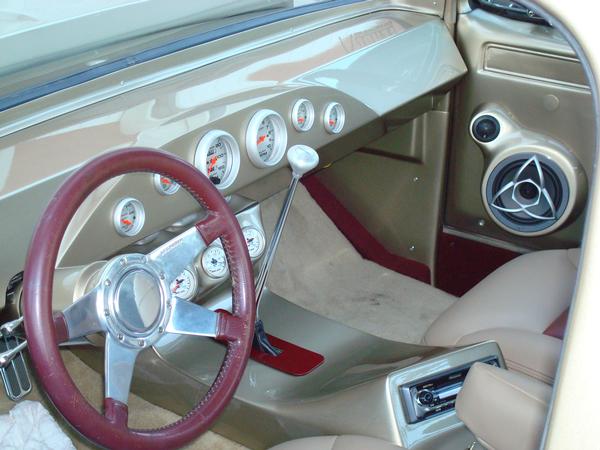 Painted headliner, door panels, and all of the pillar trim. Seats out of a 99 Tahoe with Katzkin covers, custom sheet metal dash with Auto Meter gauges. Lokar floor shifter. Flaming River stainless column. Custom center console and made kick panels and a few other fiberglass pieces