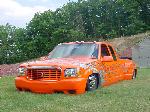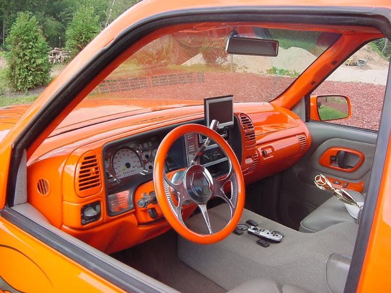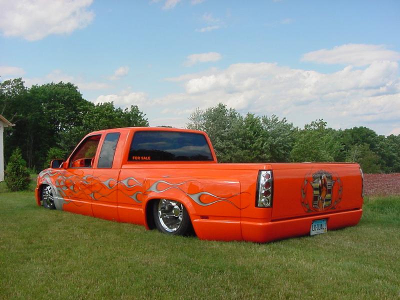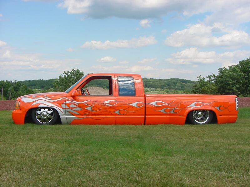 Custom PPG Orange, Double Set of Flames, Silver with a Silver Flake, Outlined in Black With an Orange Pearl. Mural on TailGate. 3 1/2 in. Stock Floor BodyDrop, Shaved Door Handles, 3rd Break Light, TailGate Handle, Gas Door, Antenna, Smoothed out bed, 99 Caddy Front End, Sir Michaels Roll Pan.