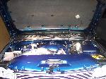 Indigo Blue Metallic, Tahoe chrome grille shell with billet inserts and billet bowtie, clear headlights and park lights, painted top bumper cap, Truckmaster designs front valance, Street Scene mirrors, Escalade door handles, Smoked factory taillights and 3rd brake light, Sir Micheals roll pan molded in, shaved tailgate with some old skool green and silver pinstriping by Perkins, HD hood. The bed floor has been raised 3 inches and has trailer fenders and notch cover all Rhino Lined black.
