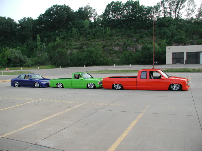 Lowered upper and lower control arms up front, dropped spindles, 2600lb firestone airbags all around, 4 Aplo 3-way electric valves, 1/2" lines, 9 gallon tank, AC Compressor, Rear 4-link setup with custom made bag brackets and shock mounts. 10" C-notch to the rear, and the bed floor remains factory after a 7 3/4" body drop. The cab is Body Dropped 3"