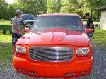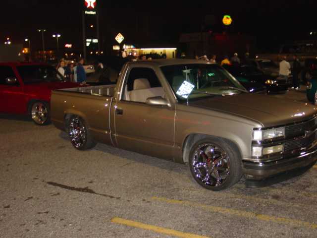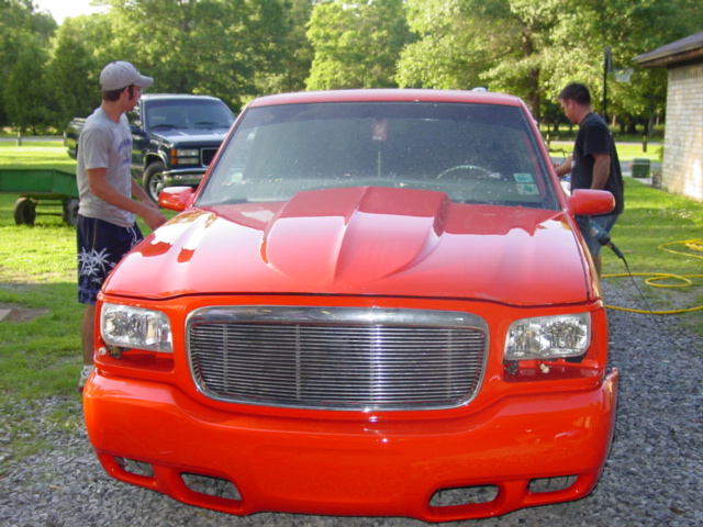 shaved doors, antenna, tail lights, rollpan, tail gate..... caddy front end with billet grill and cowl hood. And im not sure what the color is.