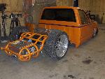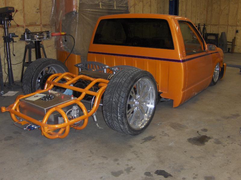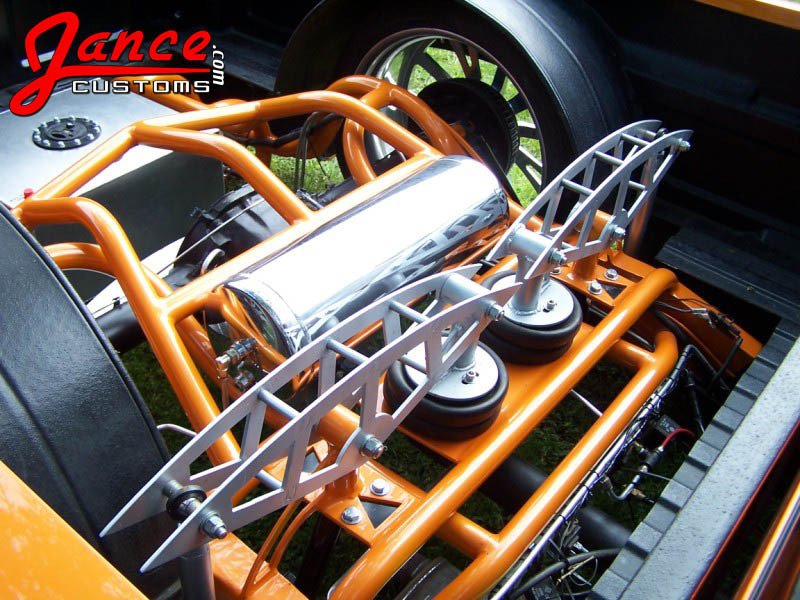 Full round tube backhalf,smoothed and painted orange, fuel cell, 2 viairs,cantilever setup,slam bags, 2 link, all done by me.