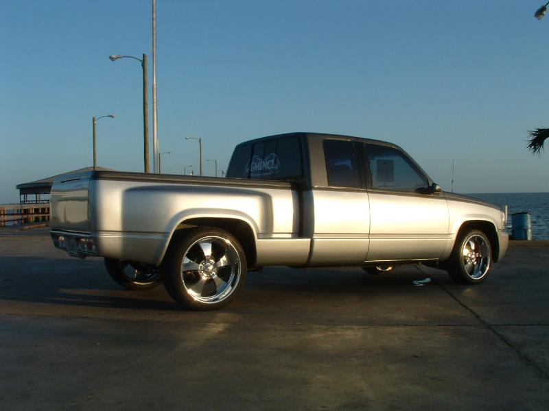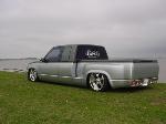 Caddy front clip, shaved door and tailgate handles, shaved 3rd brake light relocated to tailgate bodyline with 24 inch led, shaved taillights and rear step and front step pads, custom rollpan filled with modified 97 integra tails, speed glo mirrors sprayed platinum and silver bunch of scratches and dings