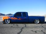 House of Kolor paint, blue base coat and orange flames sprayed by Mike at Unique R.V. and Autoworks. Shaved tailgate handle, third brake light, Sir Michaels rollpan, Street Scene mirrors