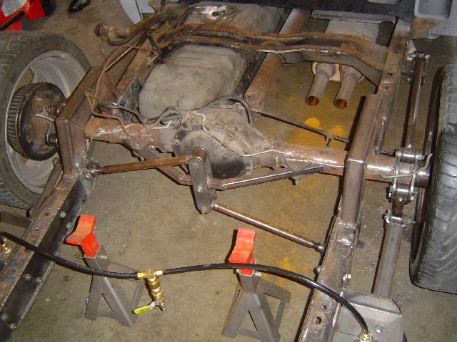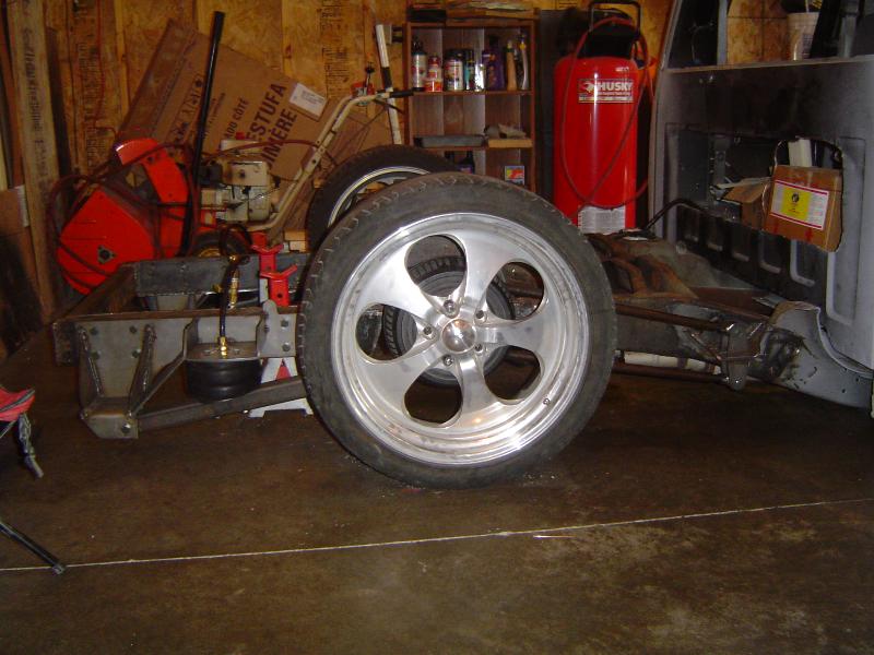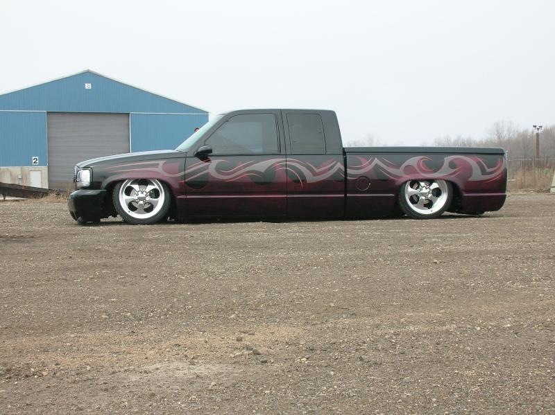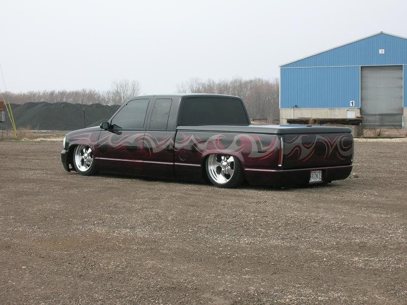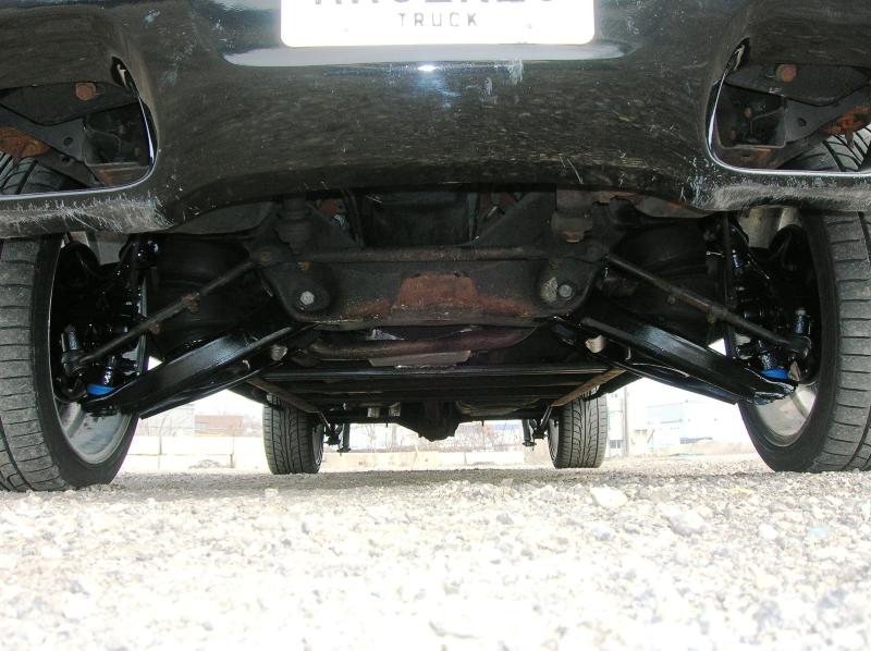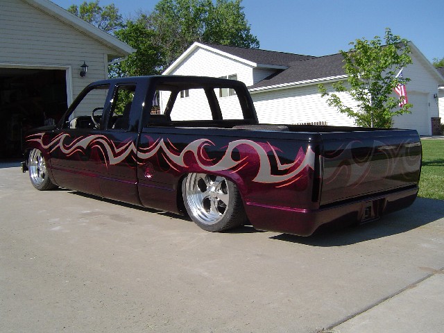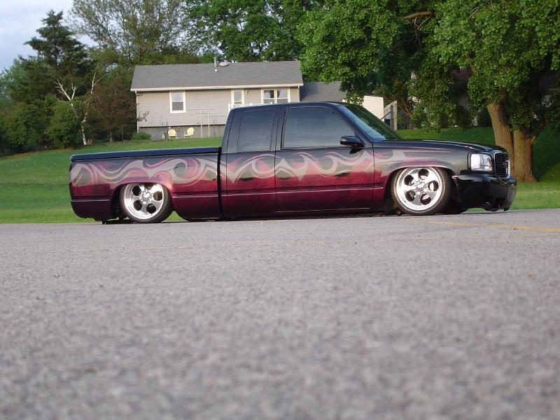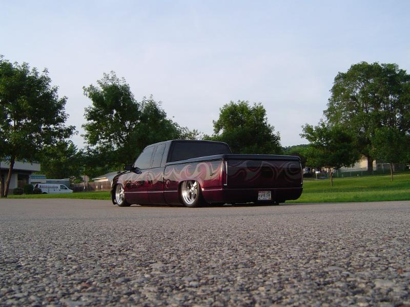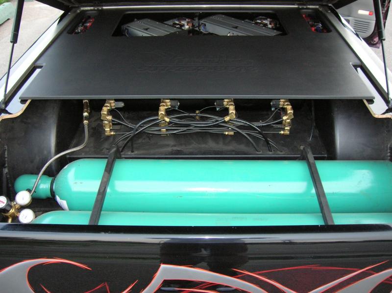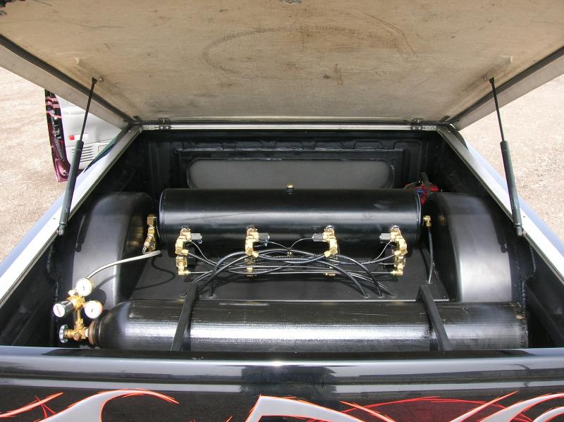 Front; Slam RE-7s sectioned suicide cups, notched and clearanced for tie rods, modded LCA's, Rear; Custom 4 link, custom canti, custom watts all by me! RE-7s, Dual 300cu Nitrogen tanks, Smith regulator, 12 gallon holding tank, (4) 1/2" ASCO valves (fills), (4) 3/8" SMC (dumps) with 1/4" line plumbed out of bed. (3) KP dual needle gauges in triple pillar pod, switches in dash, AVS 7 switch controller. rear disk brakes. A serious 12" of full lift from laying frame front and back. modding the rear for better side to side! does pretty good now