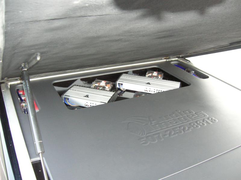 Alpine Headunit, Sirius/XM Tuners, Diamond Audio components in custom kick panels with sic plexi rings and another set of diamonds in the doors, 3 Diamond 12's in blowthru, JL 1000/1 and 300/2 amps, alpine 4x6 plates in the rear for fill. 200amp Powermaster alternator, 4 Optima red tops in the bed. 1/0 wire. ANL fusing, Neon edge/accent lighting. Clifford Alarm, Window Control, 2nd shock, radar sensor, L+R Remote door pop, PROTECTED!