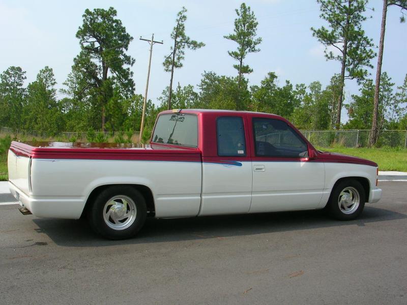 two tone White Diamond and Magnetic red pearl painjob. caddy tailights molded in rear.tailgate handle shaved. Pinstriping by Robert Madded,Cola. S.C.