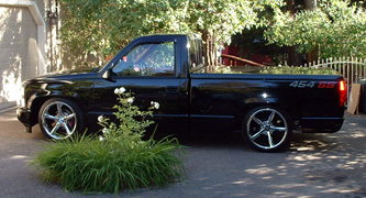 ENGINE--stock Chevy Mark IV 454 4 bolt main with a Whipple Supercharger running 8lbs. of boost. Edelbrock performer aluminum intake manifold, Comp Cams magnum 1.72 roller tip rockers, Comp Cams magnum push rods/guide plates. Edelbrock aluminum water pump. K/N air filter. translucent purple powder coated TRW valve covers w/K and N breather. Edelbrock T.E.S. 409 stainless steel headers. FlowMaster 2 chamber 3"exhaust. 180 degree thermostat.