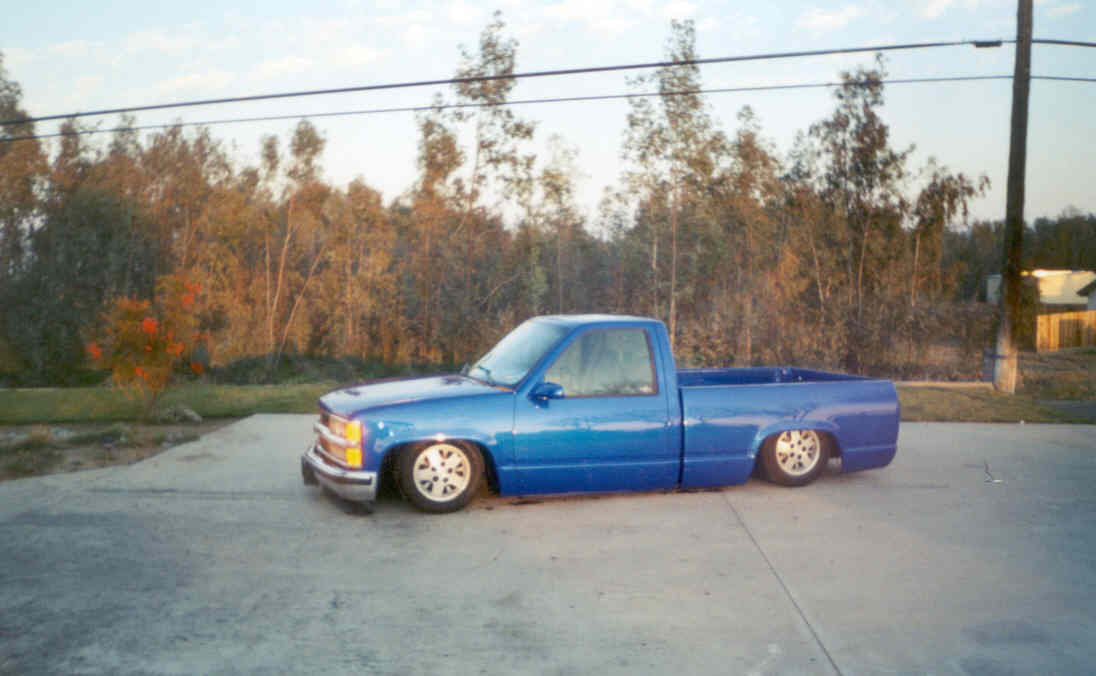 shaved doors, cab seems, gas door, tailights, tailgate, antanna, stake pockets, upper body line solid roll pan, tailgate welded shut clear LED's top of tailgate, tubbed rear fenders, notch cover, panted house of kolor true blue pearl