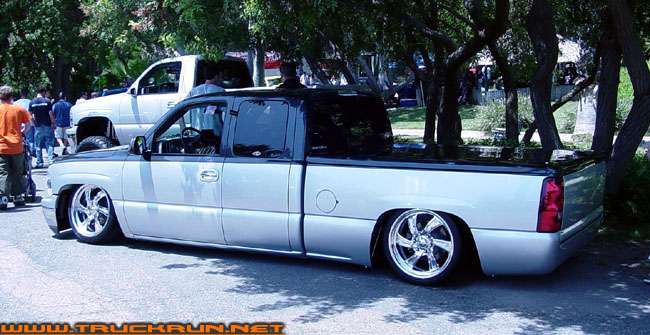 2 tone new 2003 Silverado Charcol Gray upper and stock silver. no moldings and 2003 chevy tailights, color matched Snug Top and carpet kit for the bed, Escalade rear handles(no key holes), roll pan and smooth wiper cowl