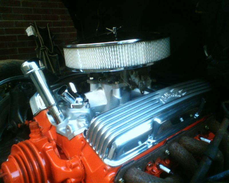 350 and 350 tranny! edlebrock torker intake 327 style classic valve covers polished. long tube headers fresh paint.