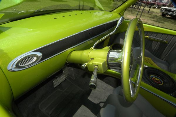 teladaga steering wheel, chrome column kit, chrome flamed mirror and pedals, gray leather,SWADE and alligator seats, smooth dash with dekota digital gauges inset and centered behind a covered screen (hidden) until turned on