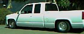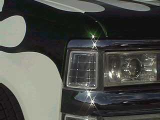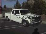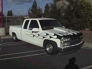 frost white paint with candy green marbled flames with purple pinstripes atop a reflections cowl induction hood. shaved handles, third brake light, tailgate handle and stake pockets. Got rid of euro headlights, stock ones back in and euro's out back came apart. gotta glue back together. hyper white bulbs.