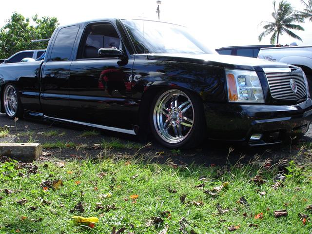 2002 Cadillac Escalade front clip, Trenz Billet grille, Frenched Cadillac taillights, LED third brake light, 35 x 25 electric sunroof, Xenon body kit, Xenon rollpan, Gaylord X-2000 bedover, Street Scene sports mirrors, Street Scene wiper cowl, Shaved door handles, Shaved gas tank cover, Shaved tailgate handle