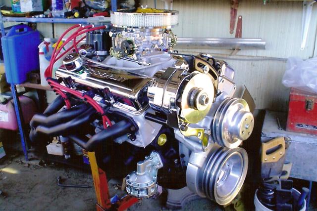 350 bored .030 over,1.94 valve heads,flat top pistons,h beam rods,edelbrock carb,intake,cam,and gear drive.hooker headers,40 series flowmaster,2 1/2 inch exhaust.turbo 350 trans with a 2500 stall converter and shift kit.