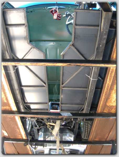 Stock floor body drop to rockers courtesy of Dimetroff Fabrication in Joplin, MO. 8 "E"xtreme 1/2 valves, 4 Slam Specialties Evolution RE7s, custom 4 link rear, ART upper and lower control arms, engine driven compressor, Easy Street gauges