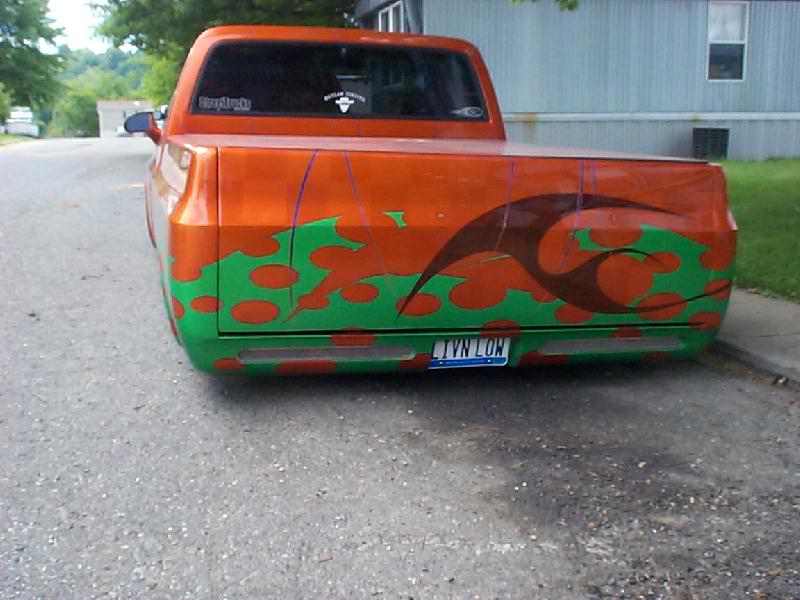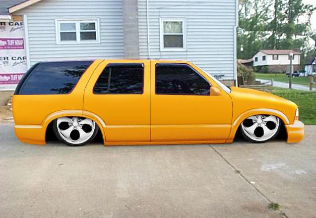 Shaved antenna, roof rack holes, and squirters. Updated the front end to 99 Jimmy healights, and 99 Envoy air dam/bumper cover and grill with Trenz Billet inserts. Reflexxion's Steel Cowlinduction hood. Street Scenes Power mirrors. Shaved door handles, rear wiper and lock, roll pan and S-10 rear quarters molded in. If you look in the pics you can see where we grafted the factory pan and the Alter Images pan together!! Moved gas tank to the rear, with a 20 gal. out of a 2dr blazer!!