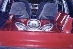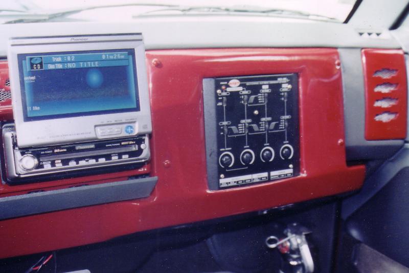 Custom built Fiberglass speakerbox, Center console, Crossover box, bowtie airvents, White faced guages, Chrome column dressup kit, Streeetglow red neons under dash, Chrome petals, Grant Signiture series steering wheele, Bucket seats in front and back,