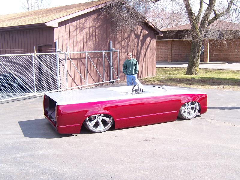 Pete and Jake's triangulated 4 link rear with firestone 2600# bags. Tubular front A-arms with 2500# and Bell Tech 2" drop spindles. Frame is back halfed with air tanks built into frame rails, smoothed and painted.