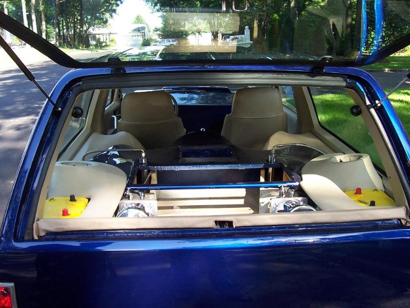 3- 15" Audiobahn subs powered by a 4000 watt MA audio amp all custom enclosed in a fiberglass box, Kenwood Components, 2 6.5 kenwoods, 2 4" pioneers and 2 more tweeters...