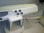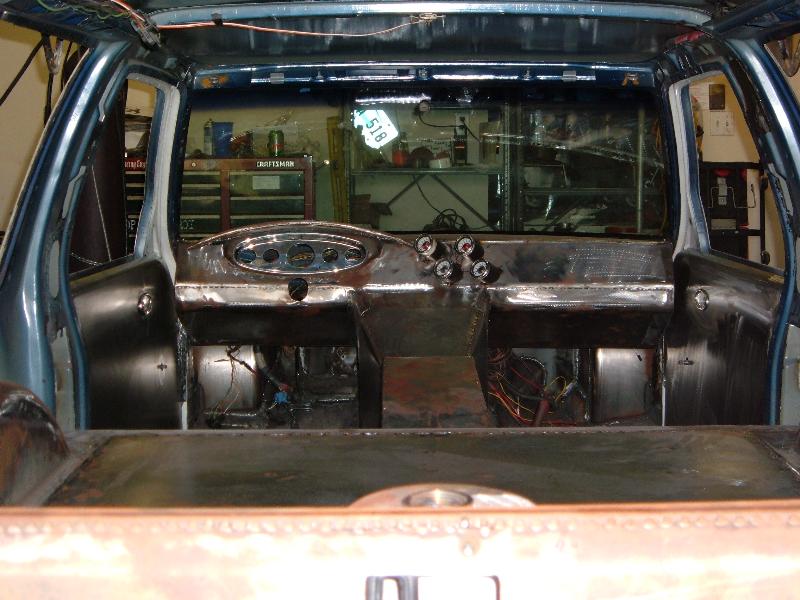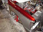 Billet Specialties steering column. Full billet Billet Specialties Vintec steering wheel. Custom sheetmetal dash and console. Lokar cluster, Moon Eyes Gauges. Easy Street Air Gauges. Metal door panels with Lokar door handles. Lokar shifter. Lokar Eliminator Floor Mount Gas Pedal, with matching Lokar Brake Pedal Pad, and Lokar Dimmer Switch Cover. Sheet metal interior done by sean@ seriously insane auto concepts. All paint work done by Donny Schreiner of MaxxMuscle Custom Cycle Painting. Julianos airplane style lap belts. Seats and headliner covered by David Corn at Pro Stitch Custom Interiors. Seats covered in red and grey suede with a dark grey strip in the middle to match the paint scheme. Silver carpet also done by David Corn.