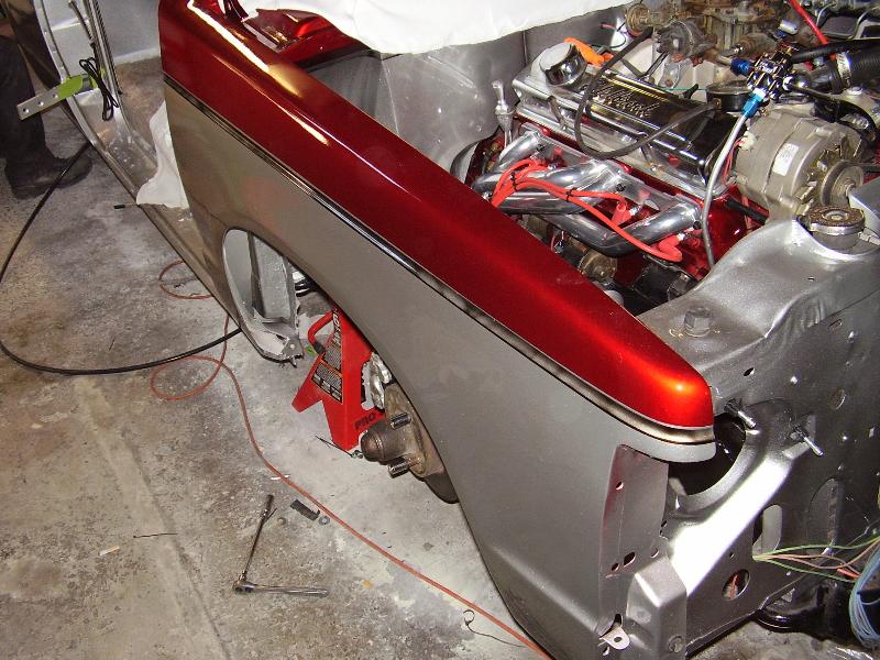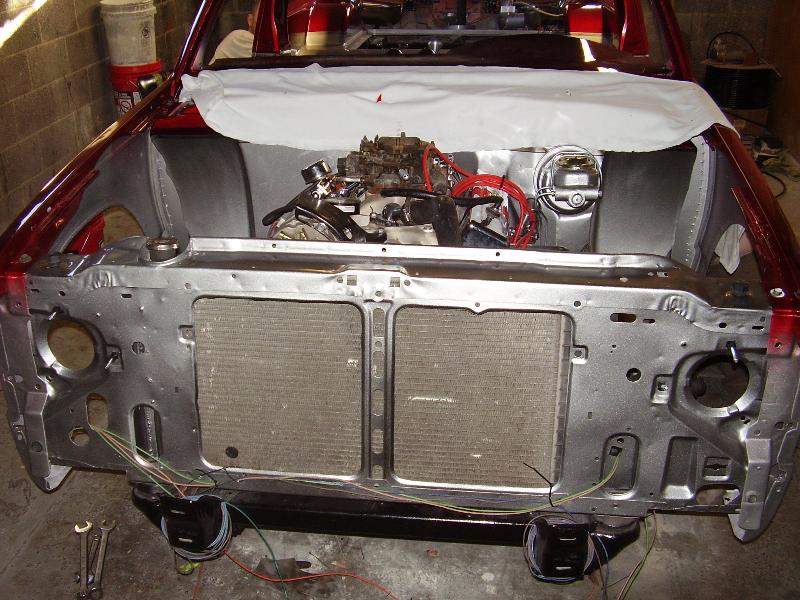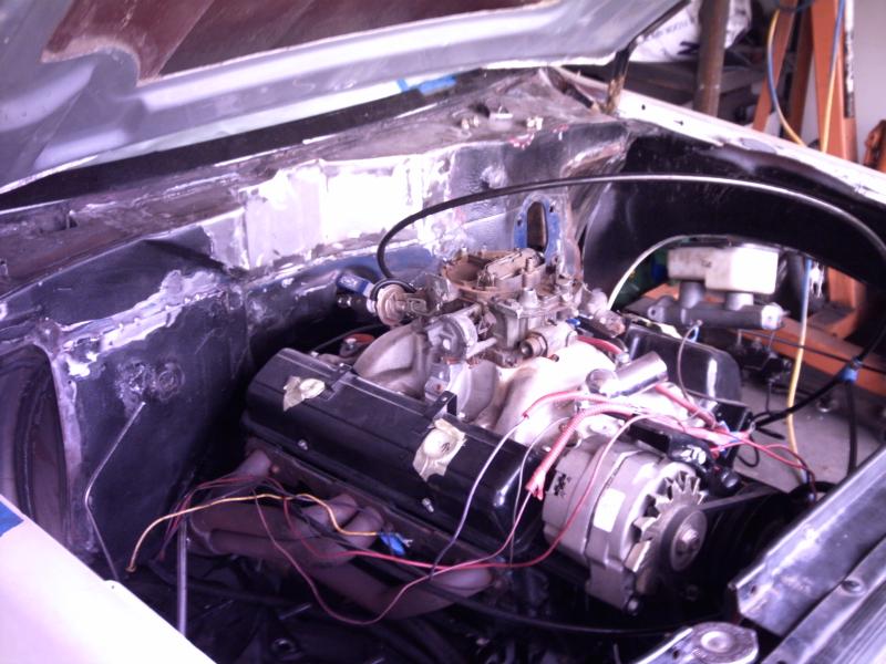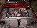 Crate 350 with 700r4 tranny. lokar shifter. some dress up stuff. Pete Jackson gear drive. Holley fuel pressure regulator. Edelbrock Aluminum Intake. Ceramic Coated Headers, 2 1/2" exhaust with Flowmasters. Engine block and transmssion painted candy red. Billet valve covers painted silver and candy red to match paint scheme. American Autowire wiring harness. Lokar Throttle Cable, Kickdown Cable, Engine Dipstick and Throttle Cable Mounting Bracket w/Return Springs. Lokar Speedometer Cable. MBM Master, and MBM 7" Dual Diaphram Booster. All stainless brake line. Billet Specialties Overflow Tank. Billet Wire Looms. All paint work done by Donny Schreiner at MaxxMuscle Custom Cycle Painting.