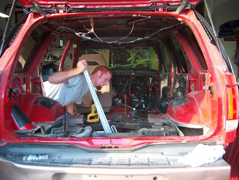 shaved tail lights, roof rack, antenna, relocate brake lights inside the back hatch behind the glass, removed then tubbed front fenders to make room for 22s, 68" sliding rag top, and crazy paint by Willy.