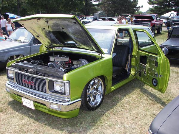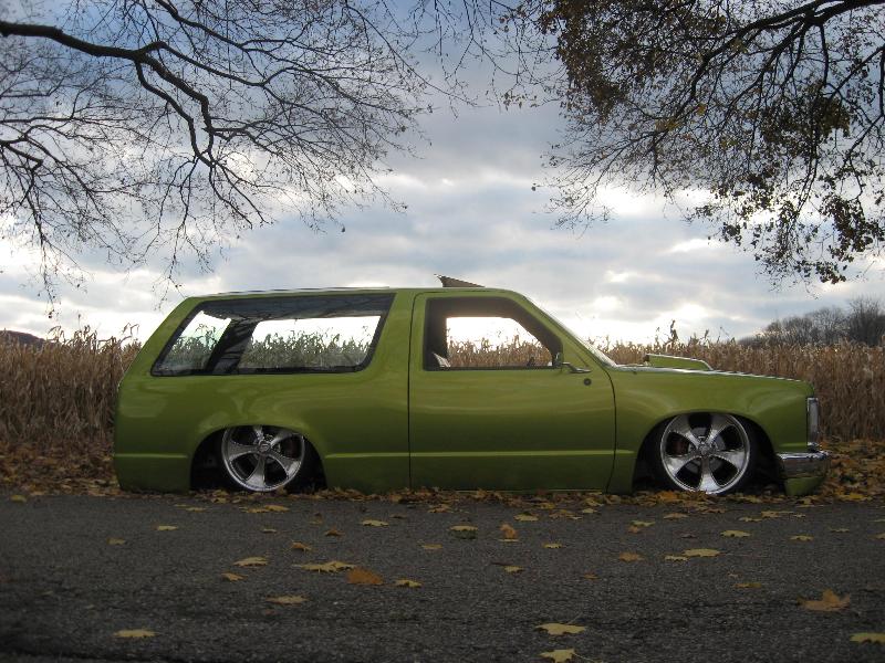 shaved: spare tire rack, handles, roof rack, body lines, emblems, roof seams, wiper cowl. Caddilac tail lights, 2nd gen s10 roll pan with 2nd gen rear s10 bedsides, suicide doors, shaker hood scoop, metal rocker extensions, toyota bumper, sunroof, all clear glass, much more but i forget...
