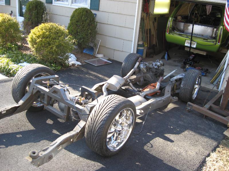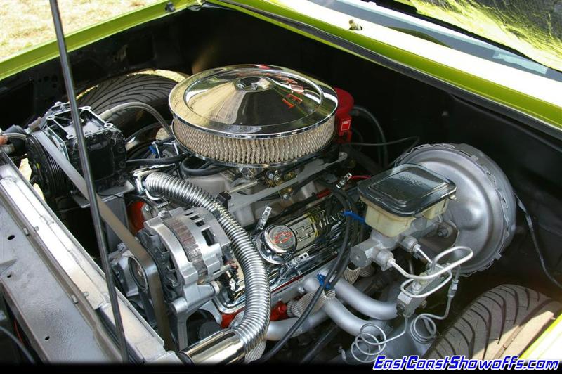 chevy 350 v8, edlebrock performer 600 cfm carb and edlebrock performer intake, lunati cam, headman headers,march billet engine puleys, hig output alt, polihed aluminum water pump, be cool rad, mallory hei, stage 2 bowtie overdrives 700r4 trans, 2600 stall converter