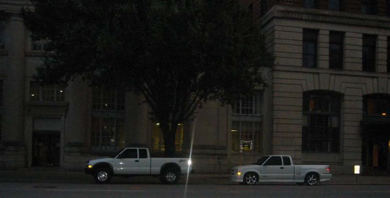 BMW style projector headlights, euro wipers, Exotic decal, blacked out windows, toneau cover, blue powder coat calipers, clear corners, clear brake lights, flame 3rd brake light cover, white APC washer lights, white underbody neons, shaved emblems, BedRug bed carpet, Street Scene custom grill, Street Scene front valance, billet chevy bowtie, rollpan with hidden hitch and flip up license plate