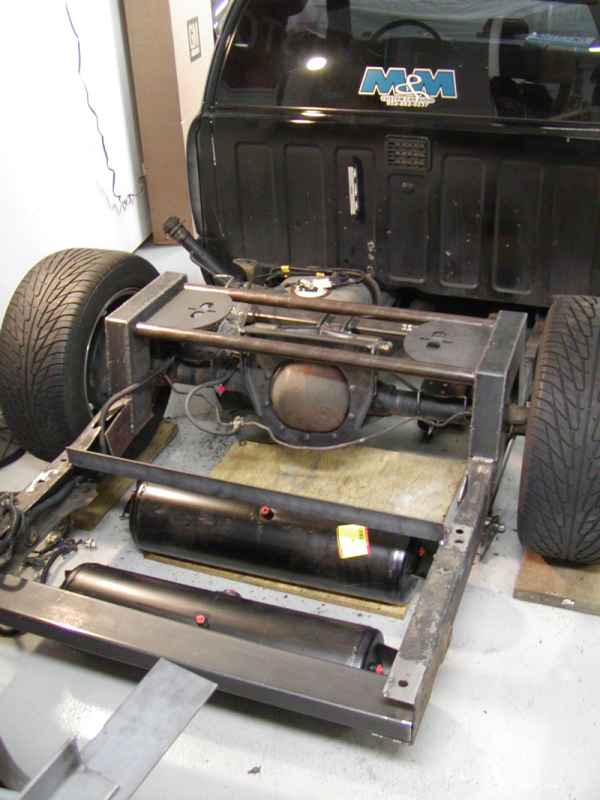 SuicideDoors 8" bridge and 3-link w/ raised gastank crossmember, AirRide upper and lower arms, Engine Driven compressor, 2600s all around, 2-7 gallon tanks(under bed), 3/8" Parker Valves w/ 5/8" orfice, 1/2" line.