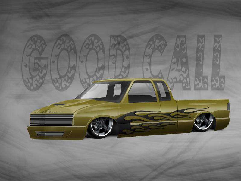 shaved side mirrors, phantom grille, grant kustoms front bumper, isuzu fenders w/ shaved corners, sheet metal bed with tear drop tubs,one off gussets by MMW at all four corners,and a smooth grant kustoms skin