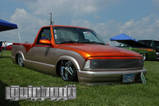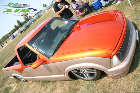 Two tone HOK Tangerine and PPG Pewter, everything shaved, phantom grill, Maltese cross tailgate, body dropped 3"