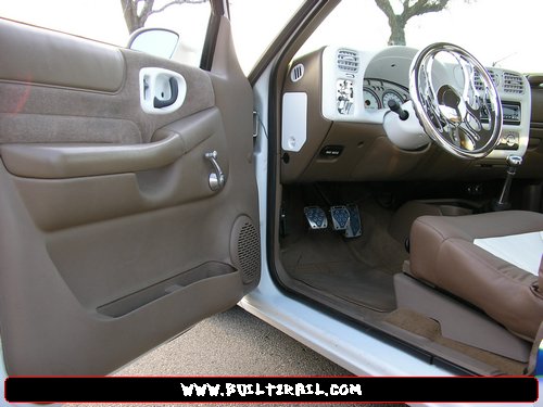 Billet Pieces here and there, Painted Dash Pieces, White Guages w/ billet overlay, Colorado Customs Billet "FIRE" Steering Wheel, Cut down seats wrapped in tan and white leather, rewrapped visors in white leather,interior done by Big Daddy's interior in Porterville, CA