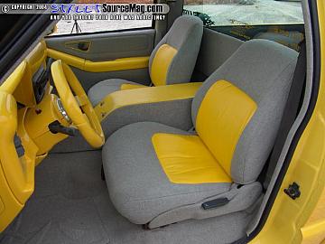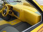 Smoothed and painted dash with billet inserts. Steering wheel installed to match dash! Tweed everything from headliner to floor, with vinyl inserts in door panels and custom made console which is also home to airbag controls covered in tweed and vinyl. Saturn bucket seats covered in tweed also with vinyl inserts. Billet inserts throughout interior. Smoothed glove compartment and Shaved air vents.