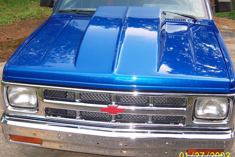 Shaved door Handles, Rear skin and rol pan, flipped handle, 4"" functional Cowl hood, Full Front chrome( grille, smooth chrome bumper.)Rear euros( gay but will work for now..Rear end tubbed and fuelk cell in bed, painted metallic Viper blue...